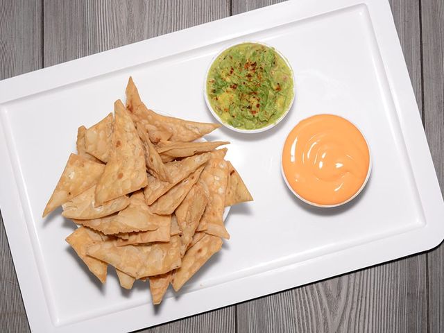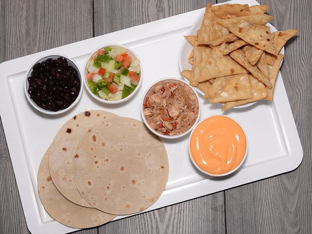 3 salsas a elección y una porción de nachos.